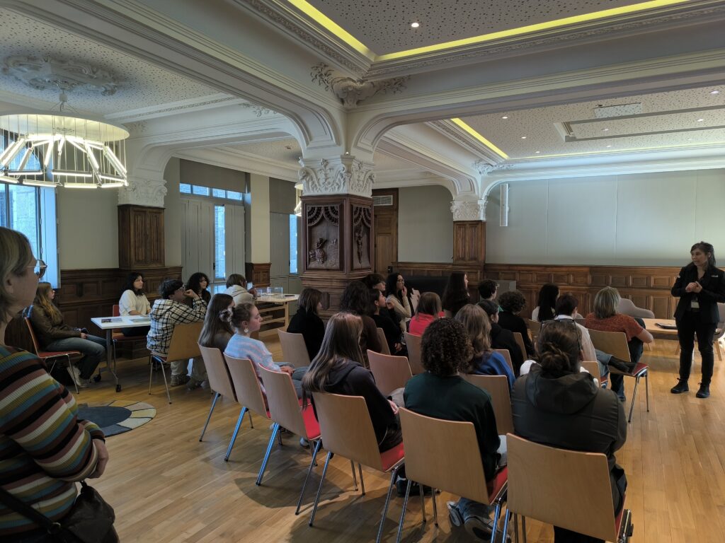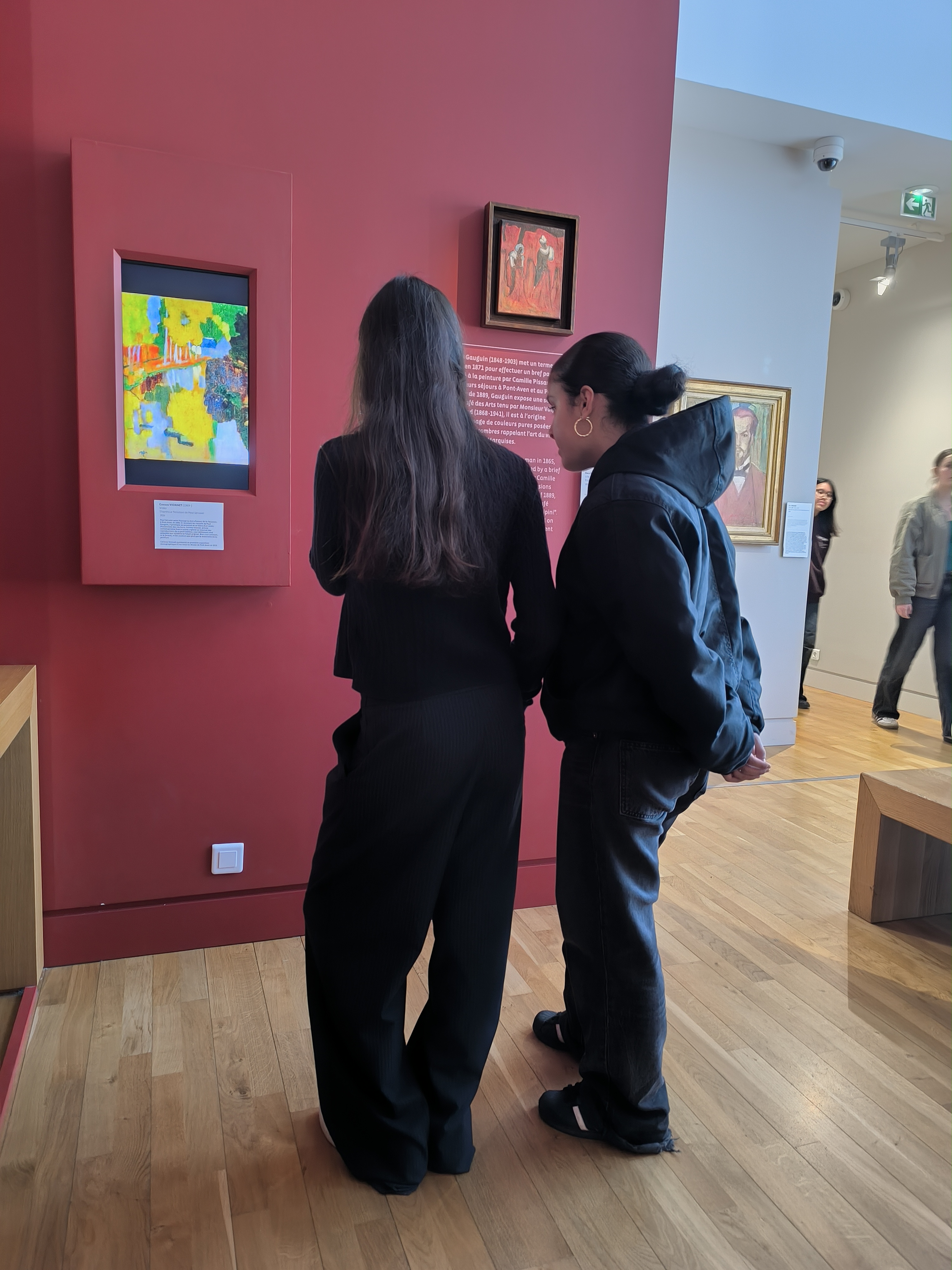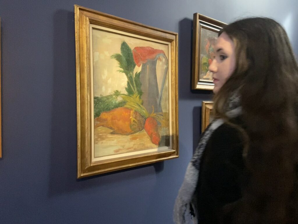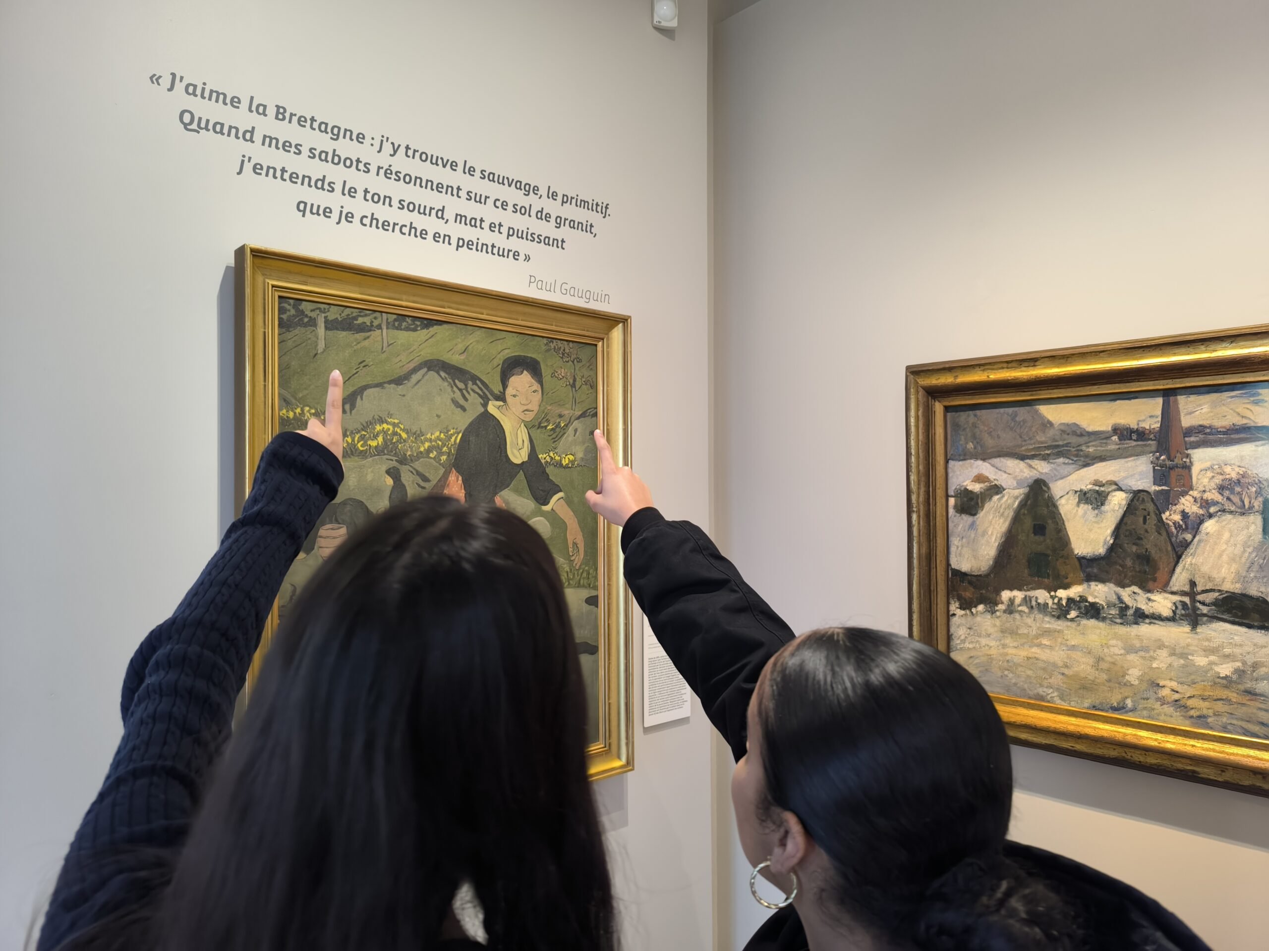 Dès leur arrivée, les élèves ont découvert l’histoire singulière du musée. Ce dernier est installé dans un ancien hôtel ayant accueilli les artistes de la célèbre Ecole de Pont Aven à la fin du XIXᵉ siècle. C’est durant cette période que la petite citée devient un véritable lieu d’attraction pour les peintres, séduits par la lumière particulière de la région, ses paysages, et la richesse de sa culture. Paul GAUGUIN, chef de file du mouvement, exprime parfaitement cette fascination pour le territoire : « J’aime la Bretagne : j’y trouve le sauvage, le primitif. Quand mes sabots résonnent sur ce sol de granit, j’entends le ton sourd, mat et puissant que je cherche en peinture. »